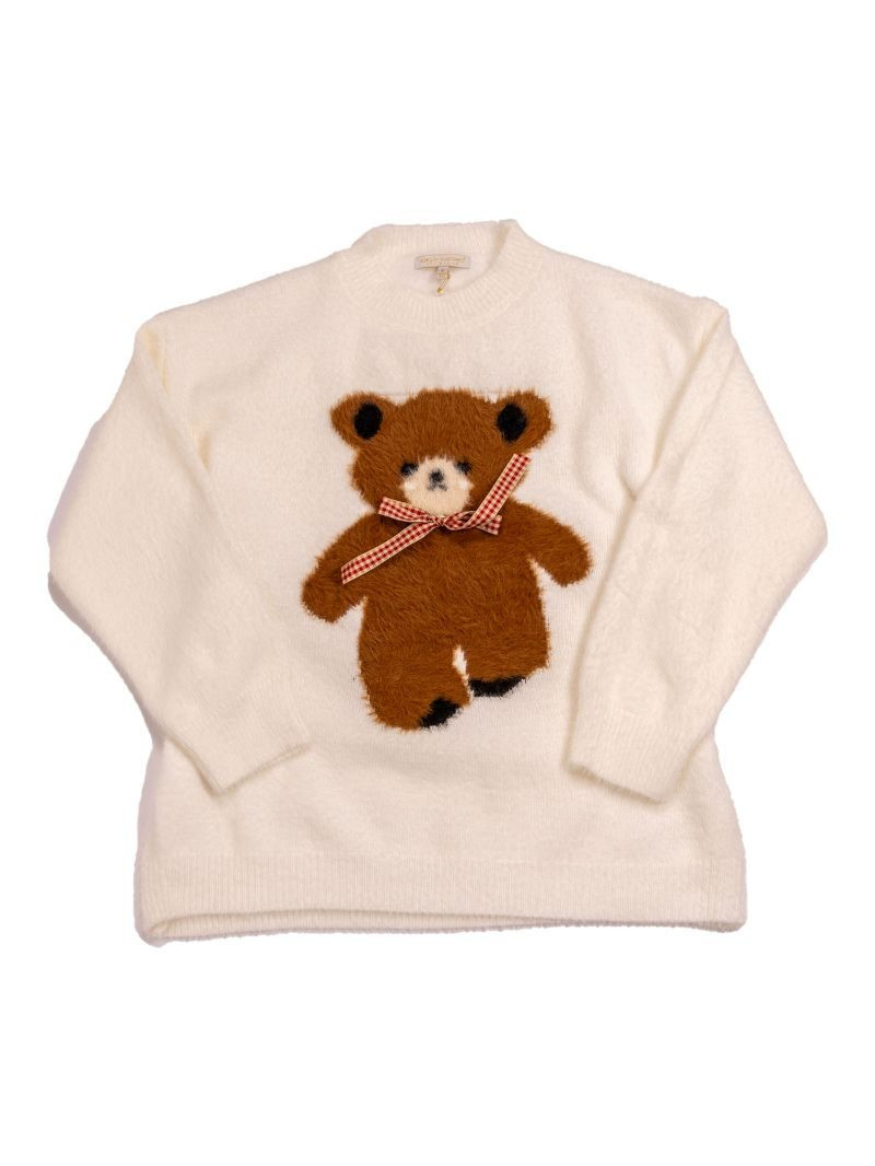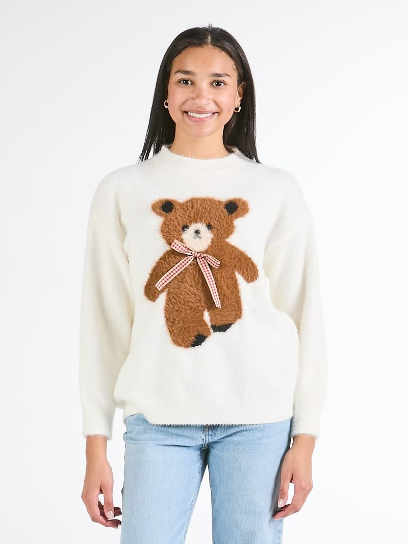 The Anastasia Sweater features multiple designs, crew neckline, relaxed fit, with cozy fuzzy texture. Made of 100% nylon.