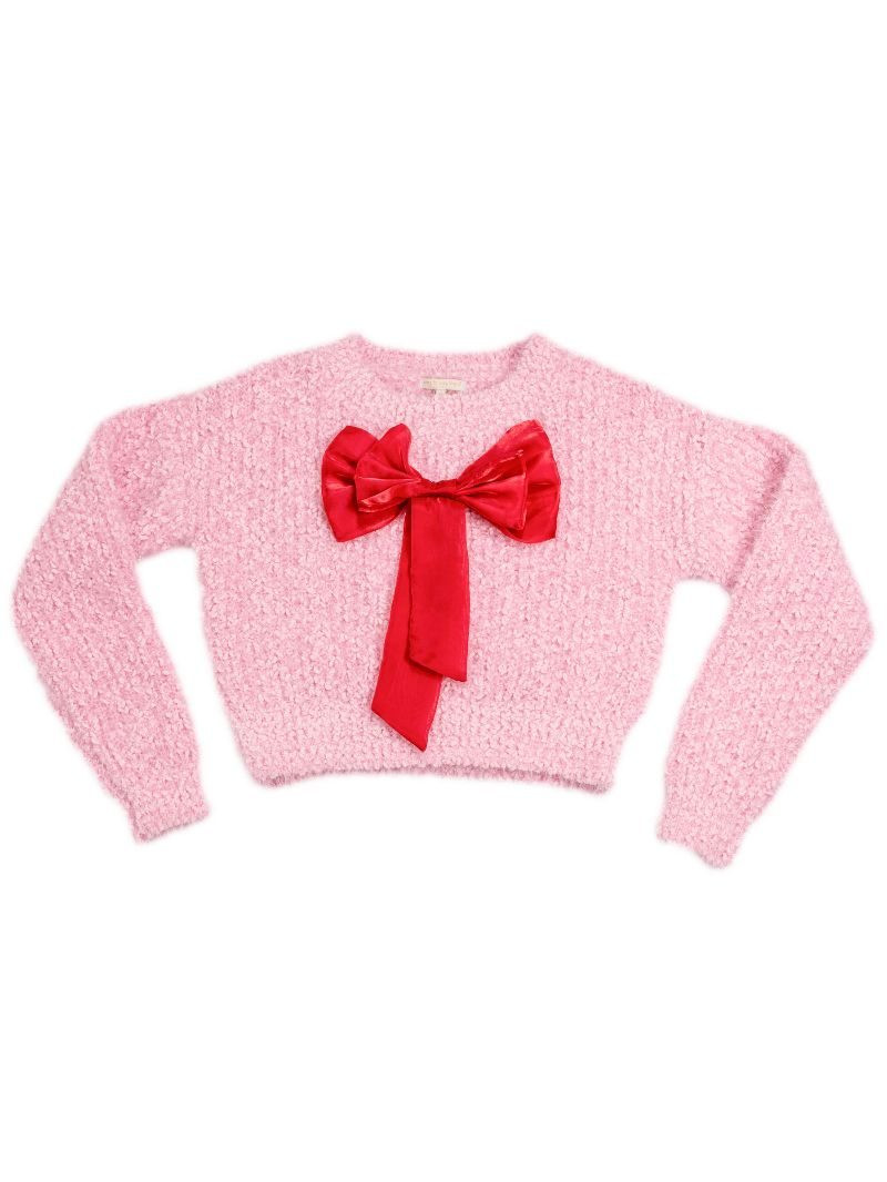 The Aurora Sweater features large bow detail with crew neckline, oversized sleeves, and cropped length. Made of 72% polyester 28% nylon.