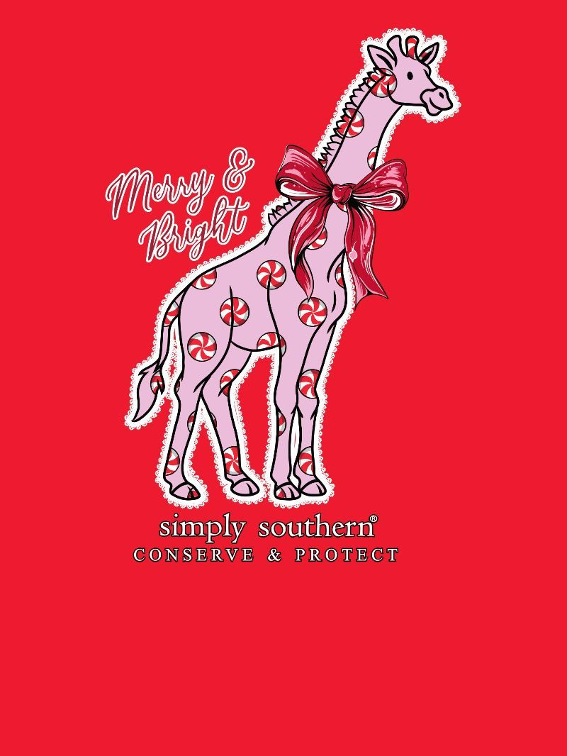 Red short sleeve shirt with the phrase 'Merry and Bright' and the silhouette of a giraffe filled with a peppermint candy pattern. Simply Southern logo below and on left chest. 100% cotton. Unisex sizing. Giraffe tracker.
