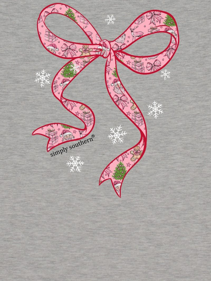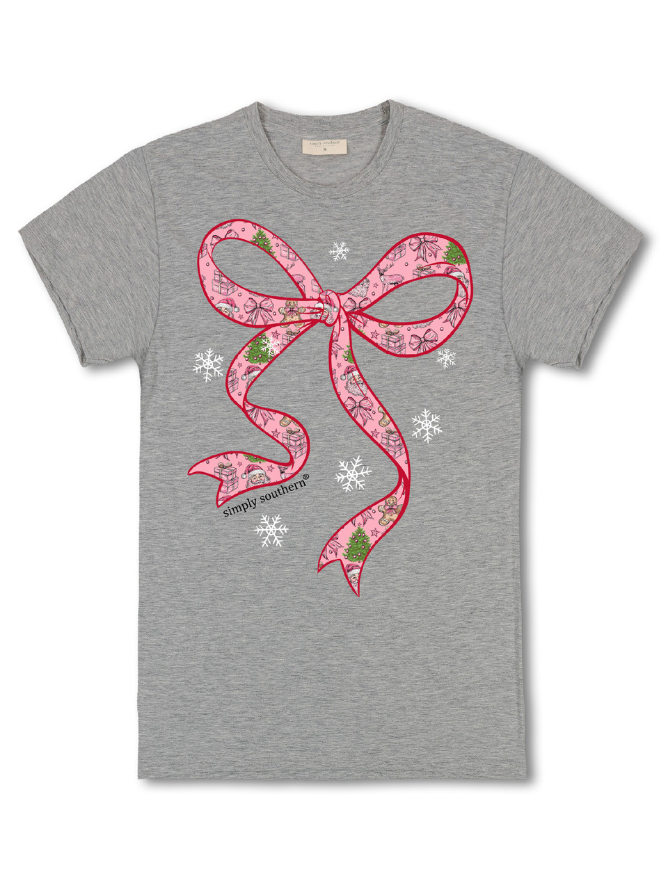 Light heather grey short sleeve shirt with a festive pink ribbon and snowflakes. Simply Southern logo below. 98% cotton / 2% polyester blend. Unisex sizing.