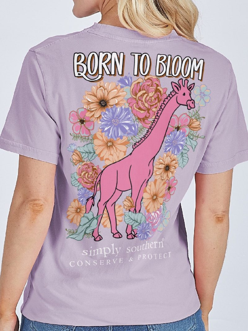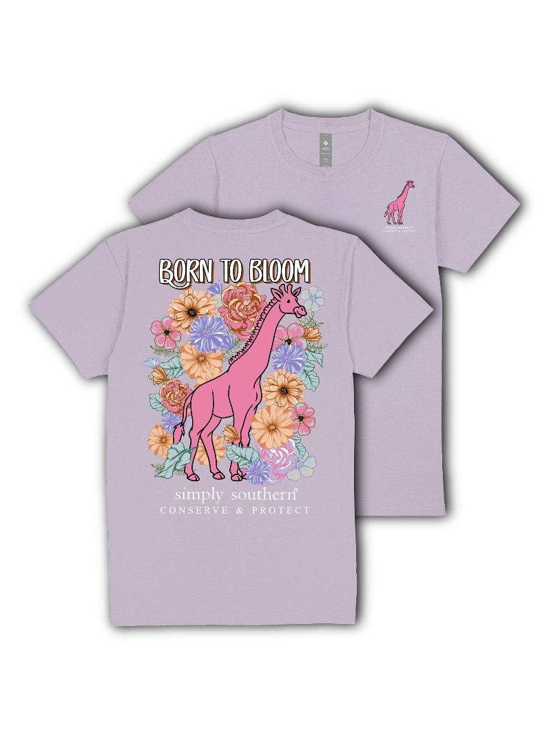 Wisteria short sleeve shirt with the phrase 'Born to bloom' and a giraffe among wildflowers. Simply Southern logo below and on left chest. 100% cotton. Unisex youth sizing. Giraffe tracker.