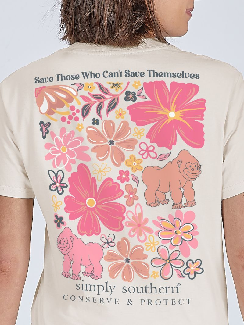 Wisp short sleeve shirt with the phrase 'Save those who can't save themselves' and a floral gorilla pattern. Simply Southern logo below and on left chest. 100% cotton. Unisex youth sizing. Gorilla tracker.