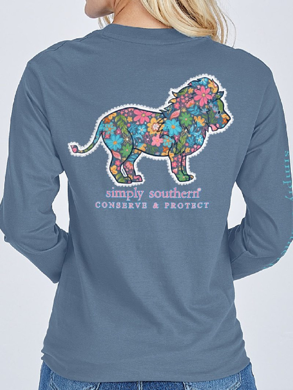 Iceland blue long sleeve shirt with the silhouette of a lion filled with a floral pattern. Simply Southern logo below, on left chest, and along right sleeve. 100% cotton. Unisex youth sizing. Lion tracker.