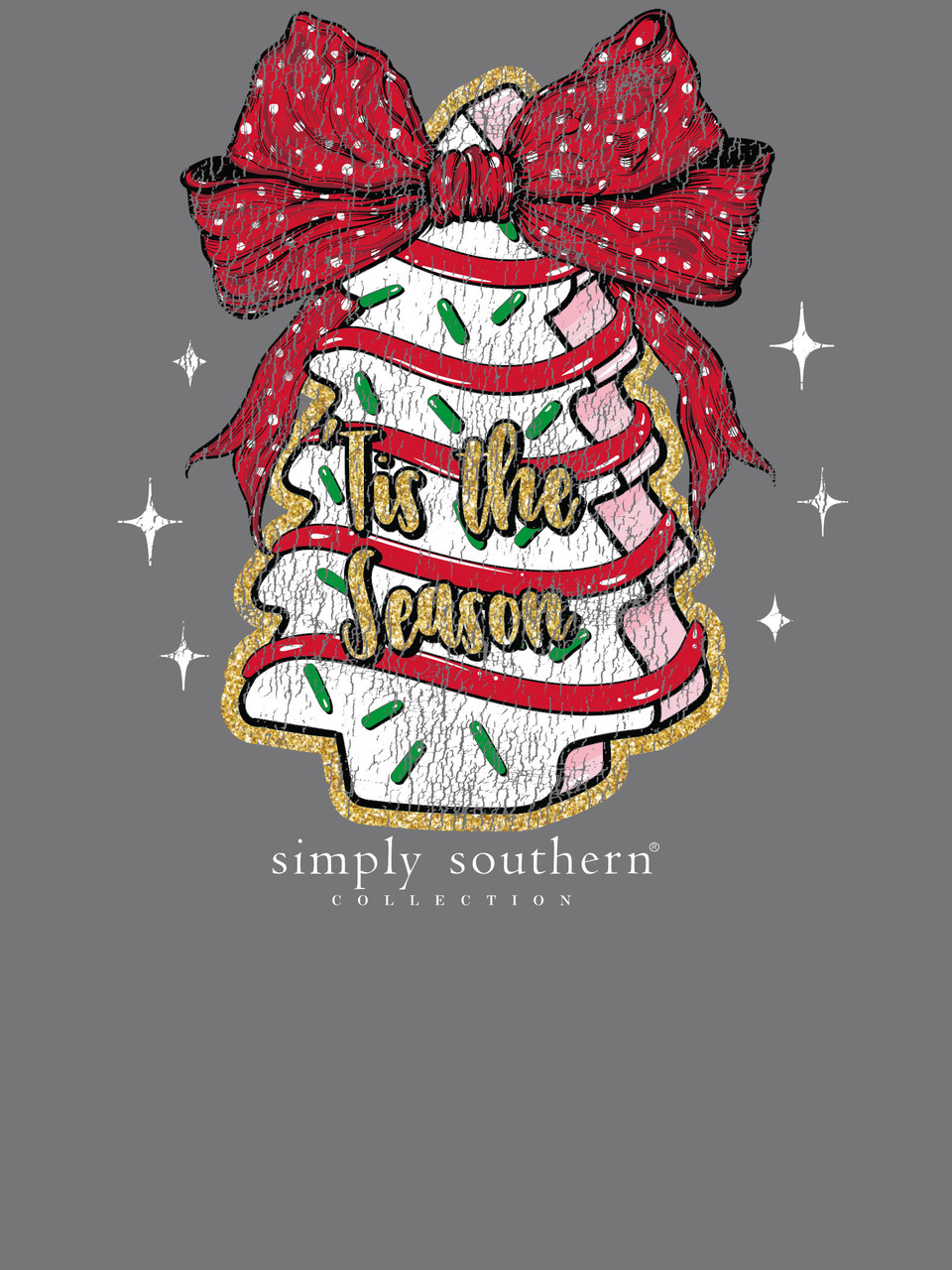 Mineral washed coal short sleeve shirt with the phrase ''Tis the Season' on a cake in the shape of a Christmas tree topped with a red bow. Simply Southern logo below. Similar design on the left chest. 100% cotton. Unisex sizing.