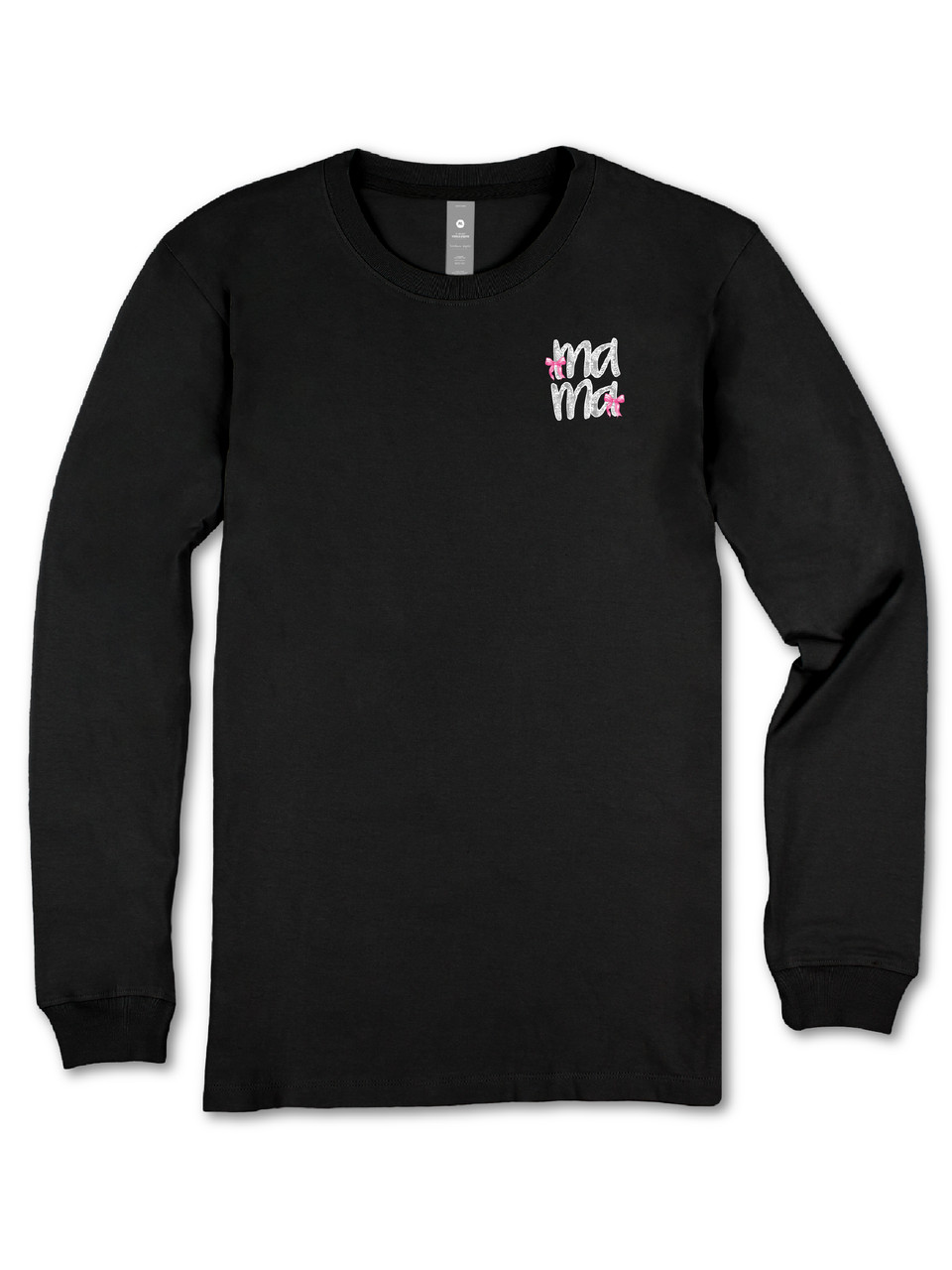 Black long sleeve shirt with the word 'Mama' detailed in lace and pink bows. Also on left chest. Pink bows along right sleeve. Simply Southern logo below. 100% cotton. Unisex sizing.