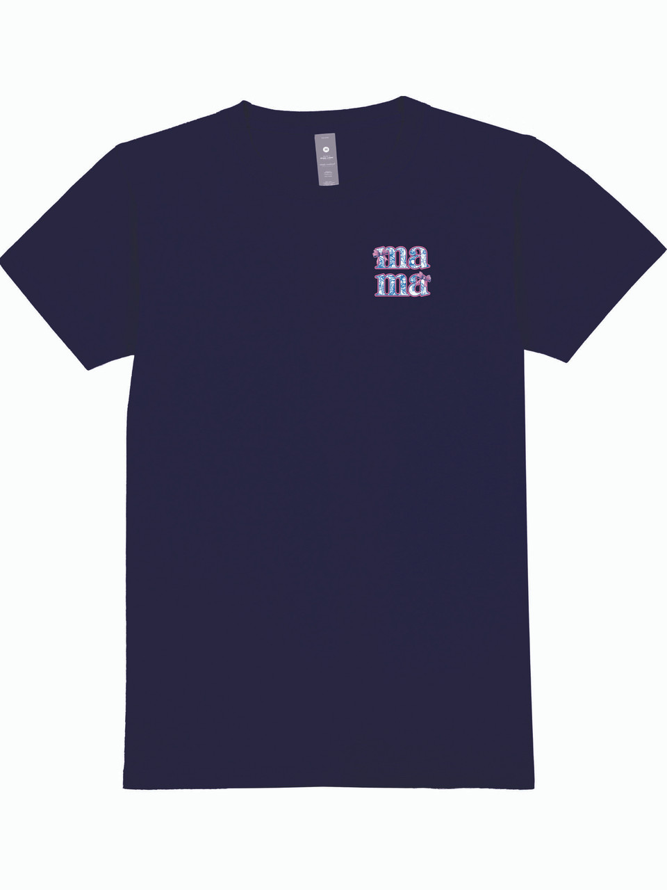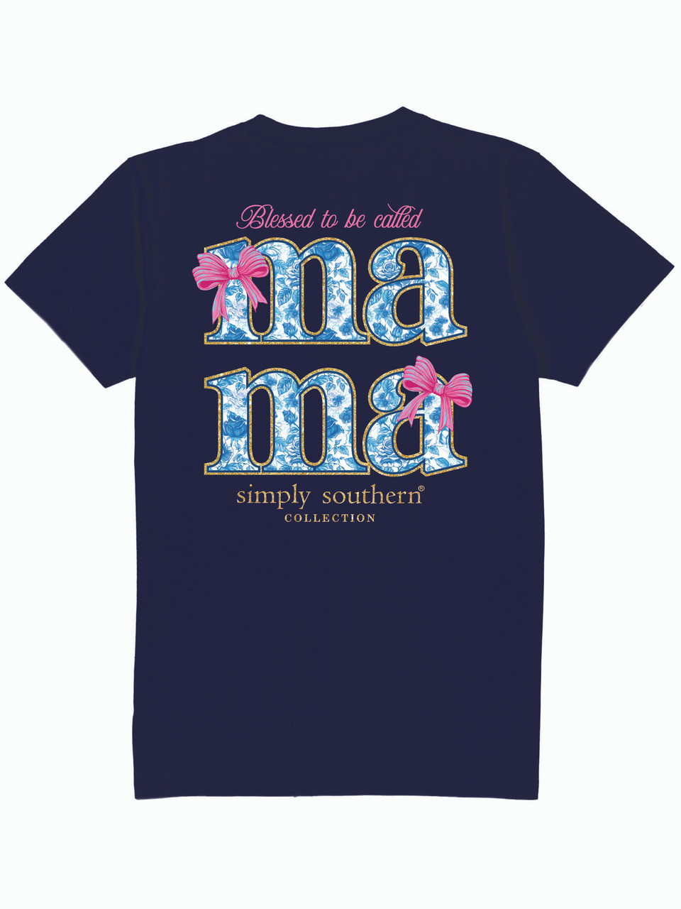 Navy blue short sleeve shirt with the phrase 'Blessed to be called mama'. The word 'mama' is filled with a blue rose motif, outlined in gold glitter, and adorned with pink bows. Simply Southern logo below. Similar design on left chest. 100% cotton. Unisex sizing.