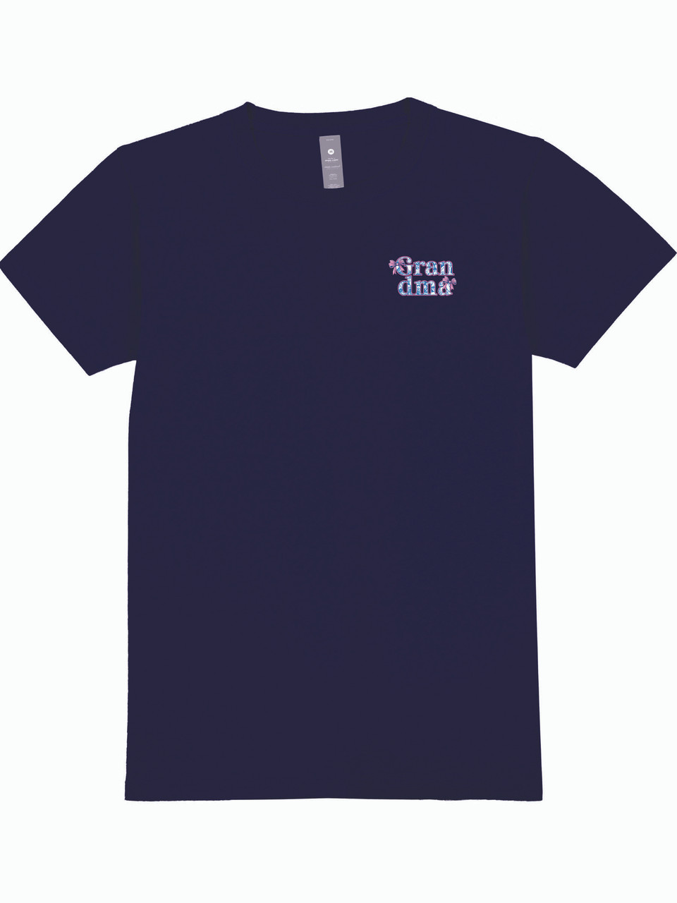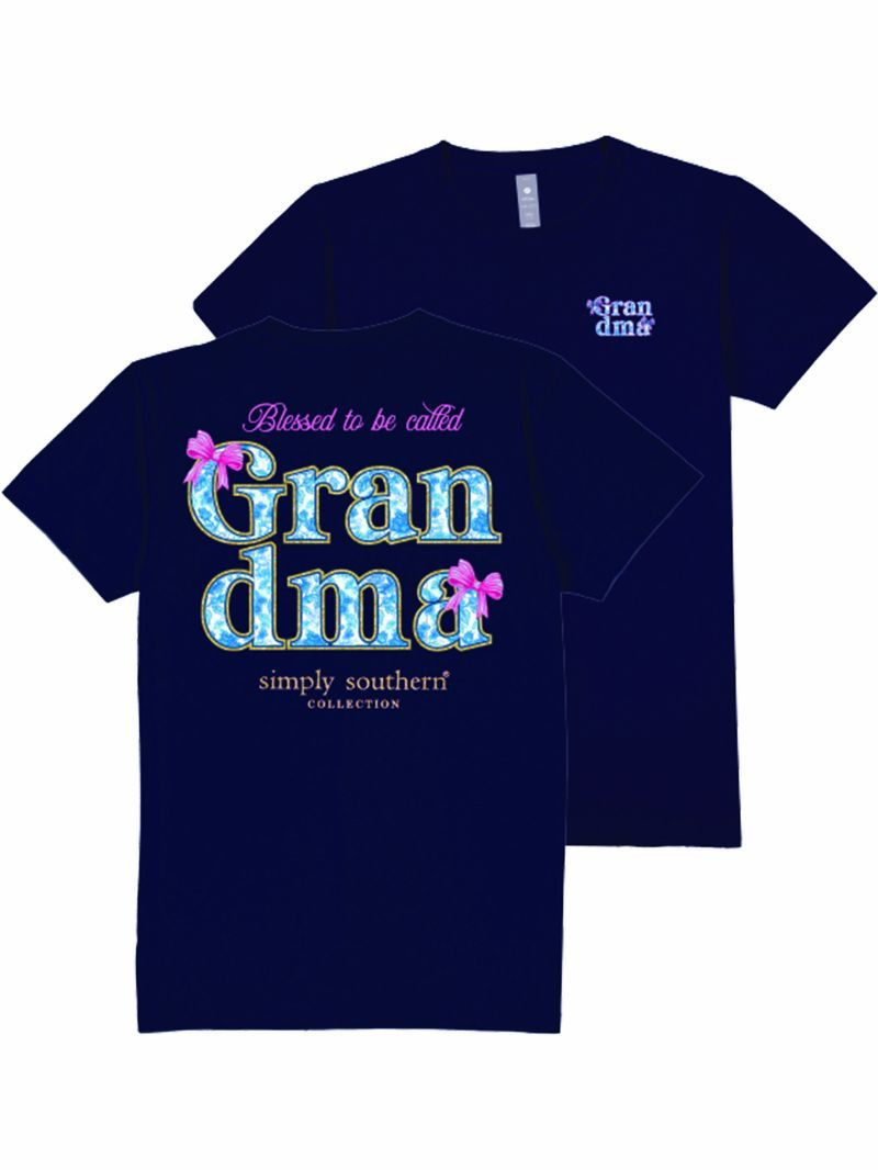 Navy blue short sleeve shirt with the phrase 'Blessed to be called grandma'. The word 'grandma' is filled with a blue rose motif, outlined in gold glitter, and adorned with pink bows. Simply Southern logo below. Similar design on left chest. 100% cotton. Unisex sizing.