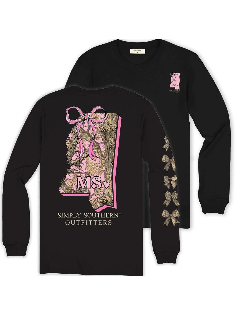 Black long sleeve shirt with the silhouette of the state of Mississippi filled with a pink camo pattern adorned with a pink ribbon and the state's abbreviation. Simply Southern logo below. Similar design on left chest. Camo hair bows along right sleeve. 100% cotton. Unisex sizing.