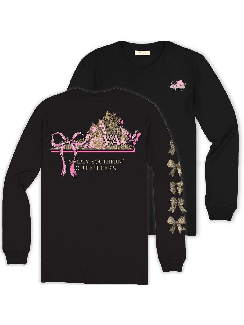 Black long sleeve shirt with the silhouette of the state of Virginia filled with a pink camo pattern adorned with a pink ribbon and the state's abbreviation. Simply Southern logo below. Similar design on left chest. Camo hair bows along right sleeve. 100% cotton. Unisex sizing.