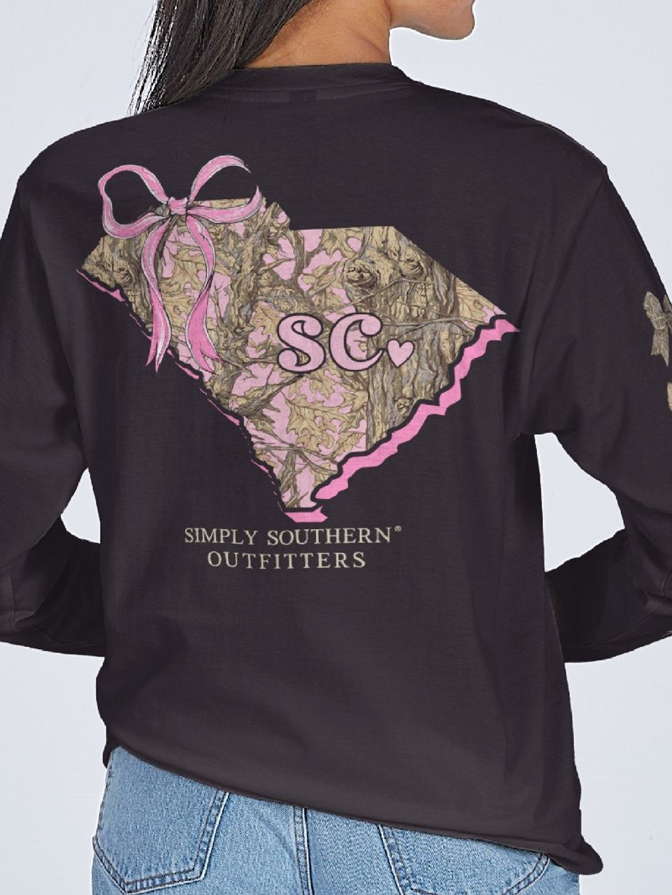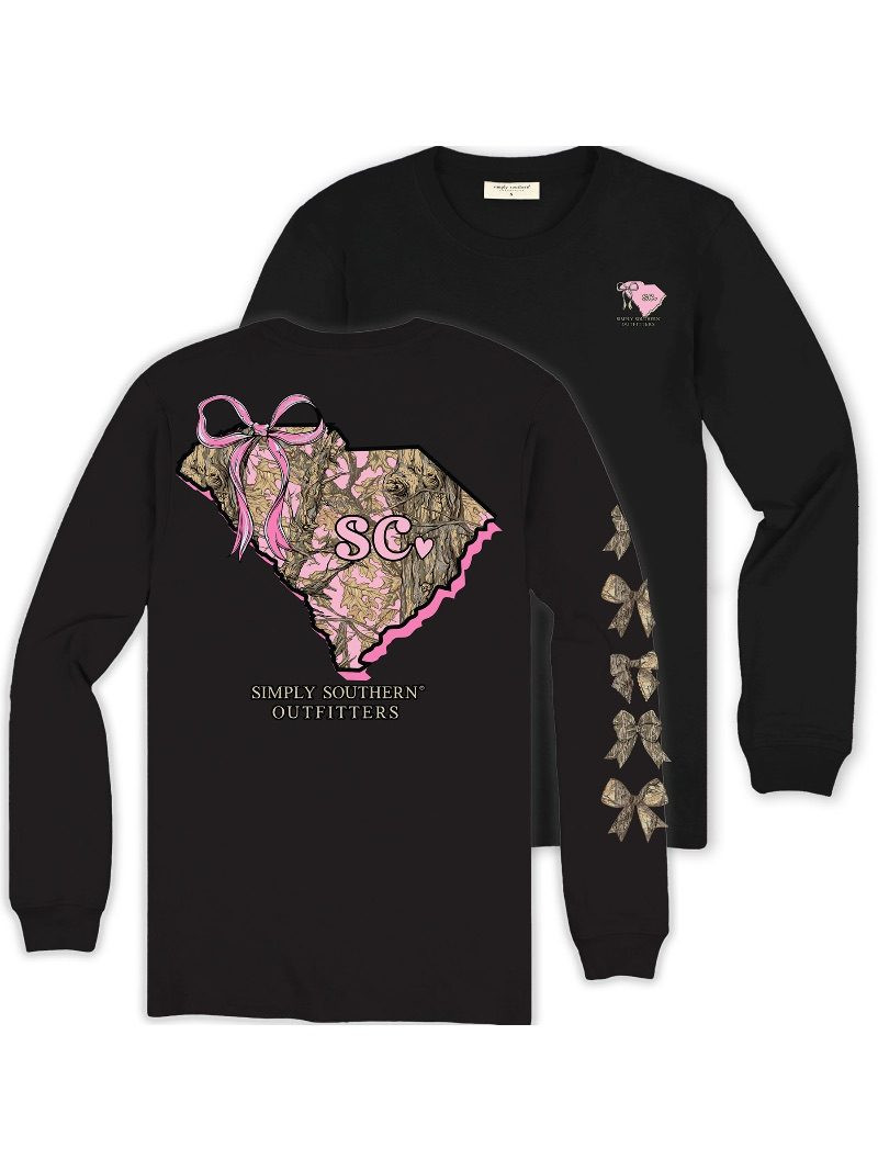 Black long sleeve shirt with the silhouette of the state of South Carolina filled with a pink camo pattern adorned with a pink ribbon and the state's abbreviation. Simply Southern logo below. Similar design on left chest. Camo hair bows along right sleeve. 100% cotton. Unisex youth sizing.