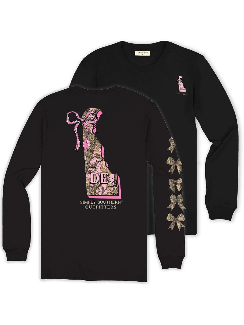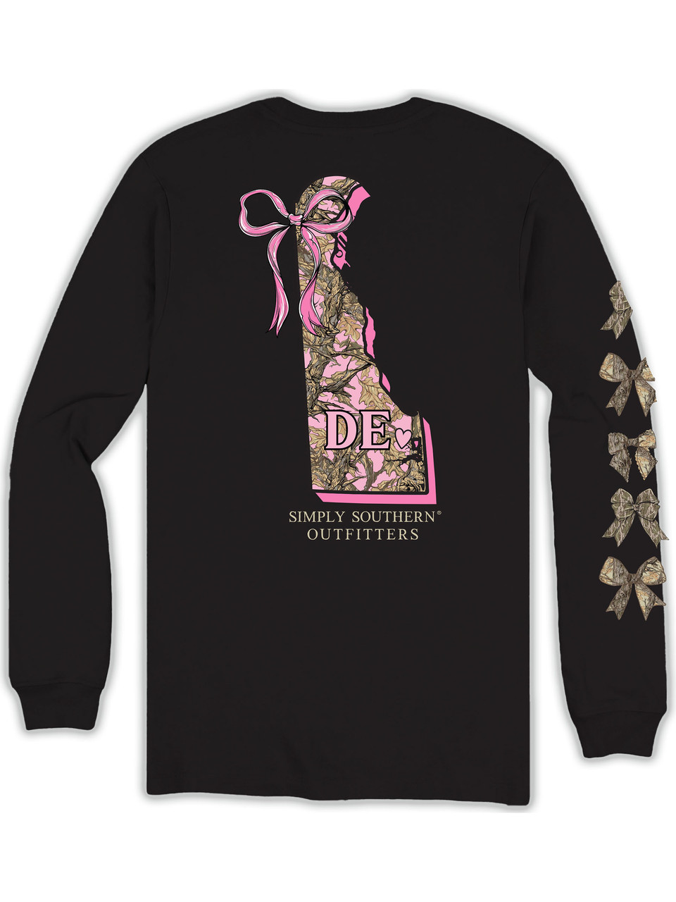 Black long sleeve shirt with the silhouette of the state of Delaware filled with a pink camo pattern adorned with a pink ribbon and the state's abbreviation. Simply Southern logo below. Similar design on left chest. Camo hair bows along right sleeve. 100% cotton. Unisex sizing.