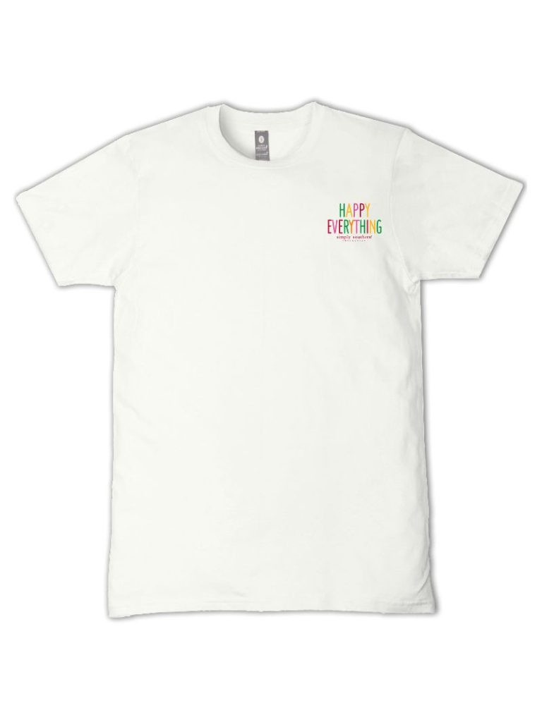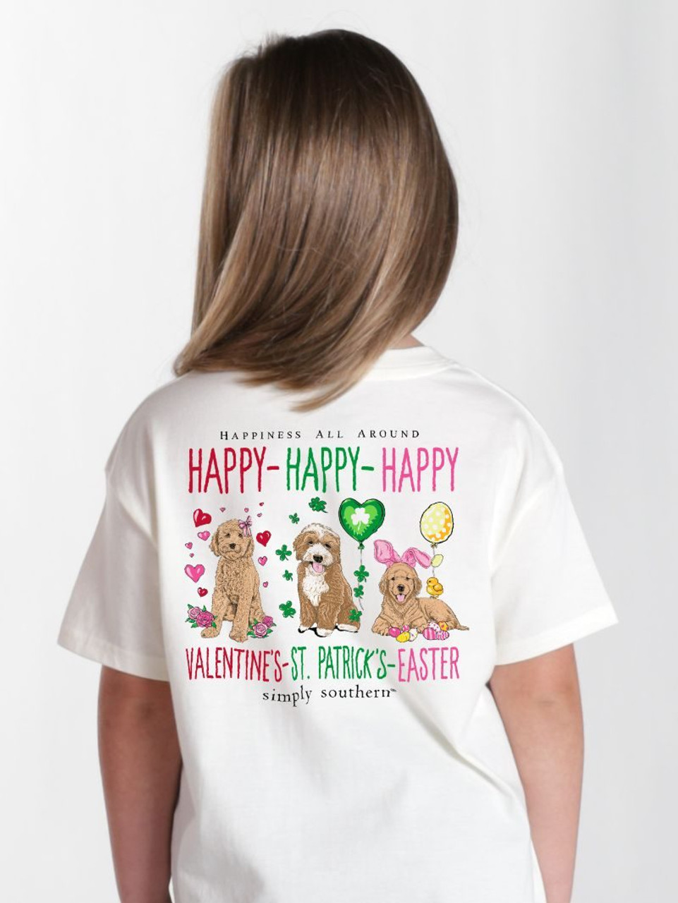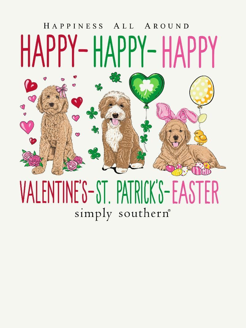 Made from 100% soft, breathable cotton, this short sleeve basic tee delivers all-day comfort in a clean, classic cut. This oyster white tee features the phrases 'Happiness All Around' and 'Happy-Happy-Happy Valentine's-St. Patrick's-Easter' and three dogs representing each holiday.