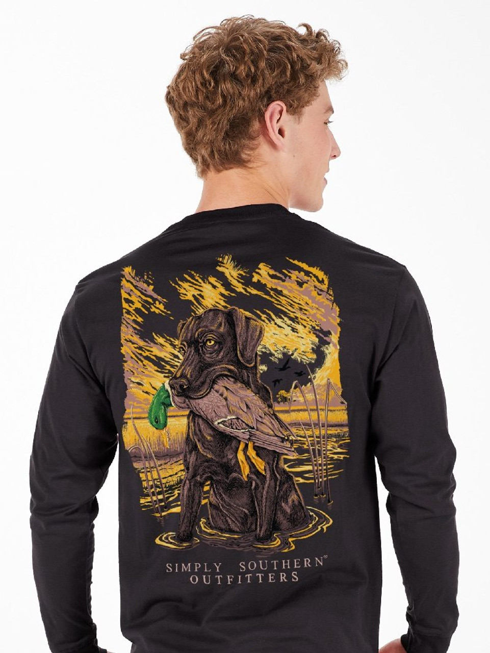 Black long sleeve shirt with a dog sitting in the swamp with a retrieved duck at sunrise. Simply Southern logo below and on left chest. 100% cotton. Unisex sizing.