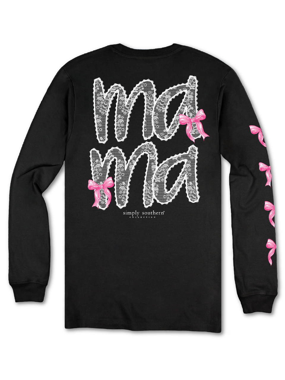Black long sleeve shirt with the word 'Mama' detailed in lace and pink bows. Also on left chest. Pink bows along right sleeve. Simply Southern logo below. 100% cotton. Unisex sizing.