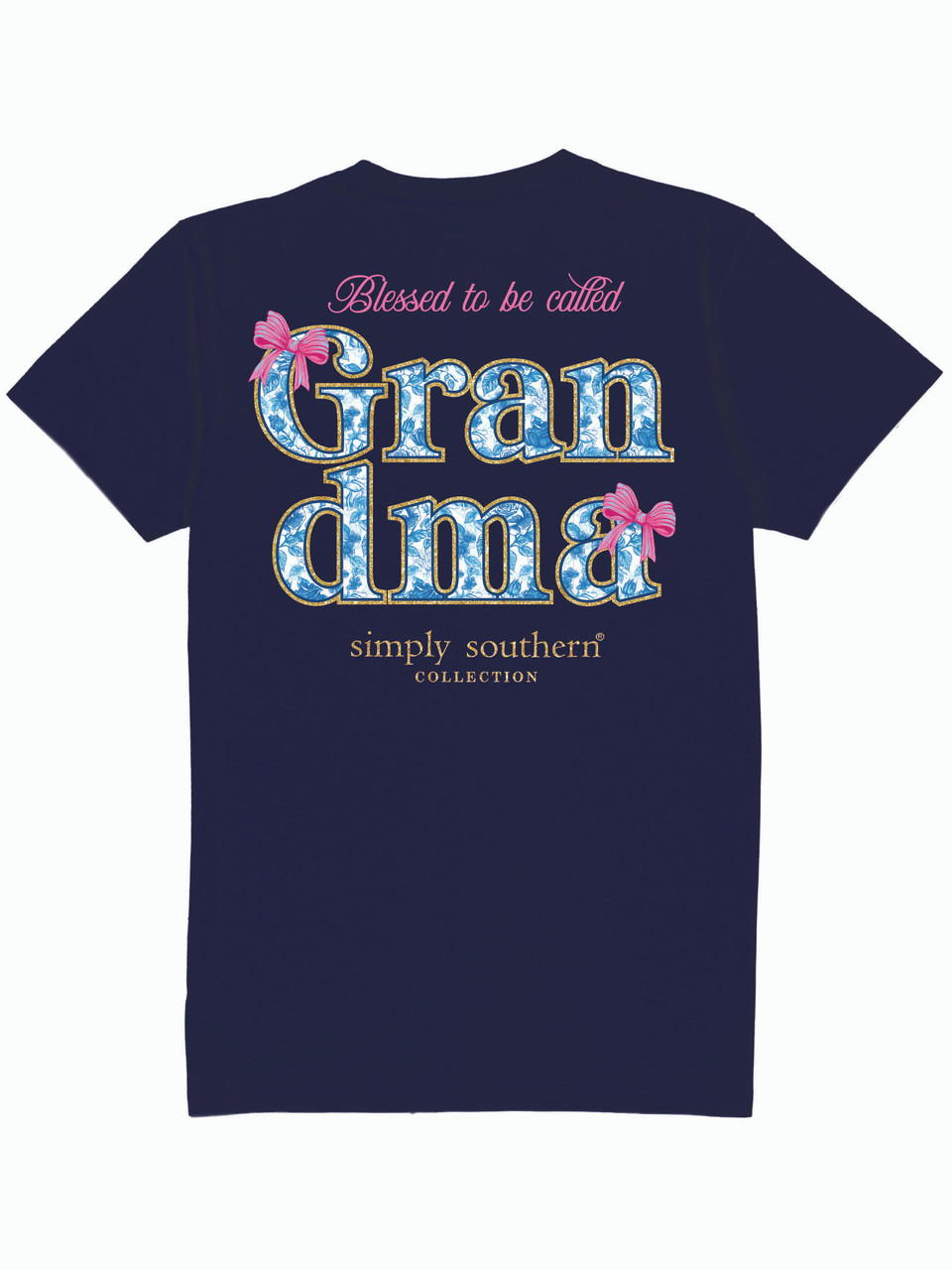 Navy blue short sleeve shirt with the phrase 'Blessed to be called grandma'. The word 'grandma' is filled with a blue rose motif, outlined in gold glitter, and adorned with pink bows. Simply Southern logo below. Similar design on left chest. 100% cotton. Unisex sizing.