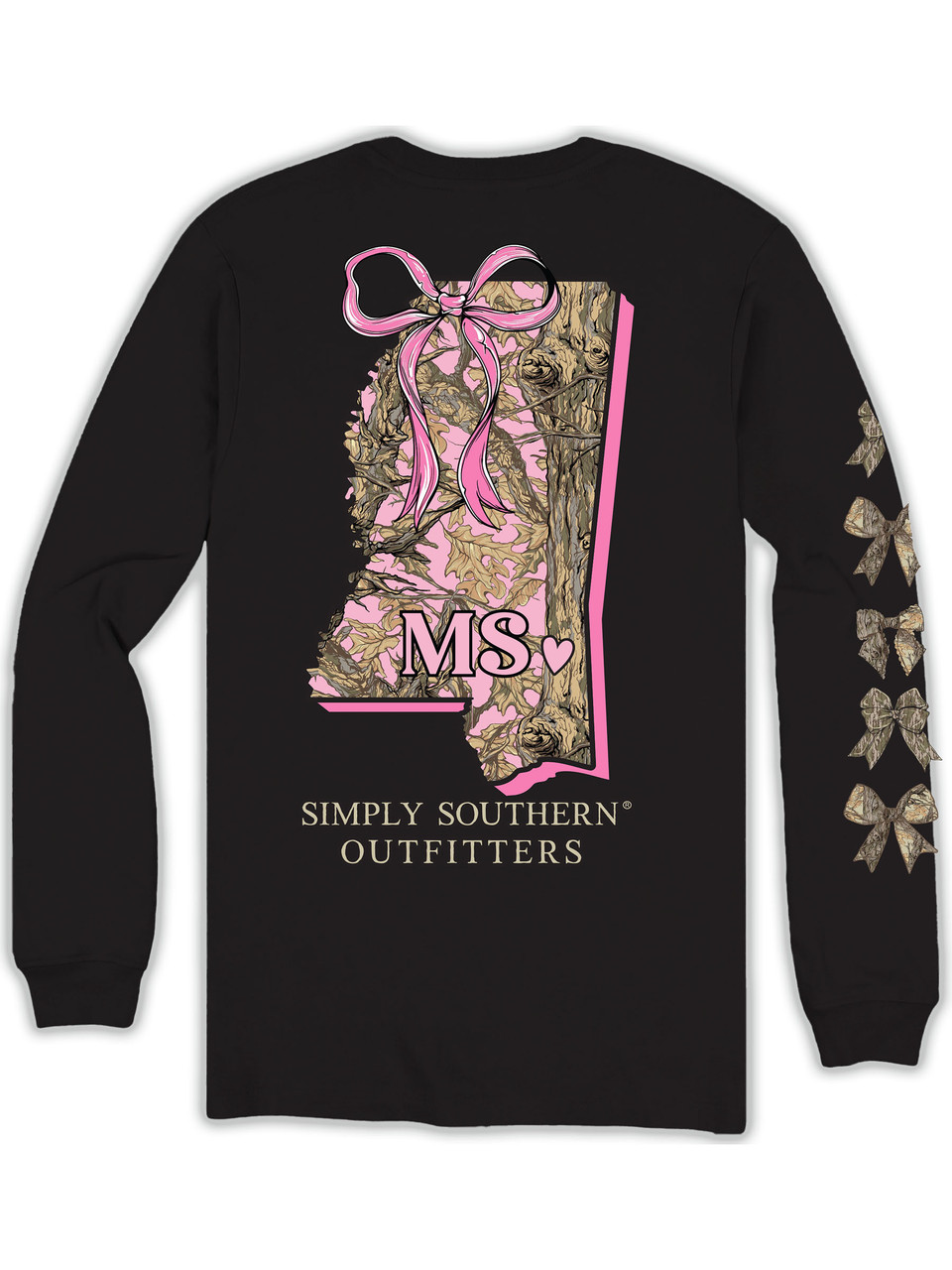Black long sleeve shirt with the silhouette of the state of Mississippi filled with a pink camo pattern adorned with a pink ribbon and the state's abbreviation. Simply Southern logo below. Similar design on left chest. Camo hair bows along right sleeve. 100% cotton. Unisex sizing.